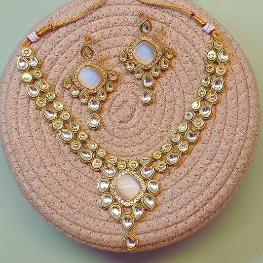 Sierra The Label Stylish Statement Necklace & Earrings With Embellished Green Stones And Faux Pearls For Girls And Women