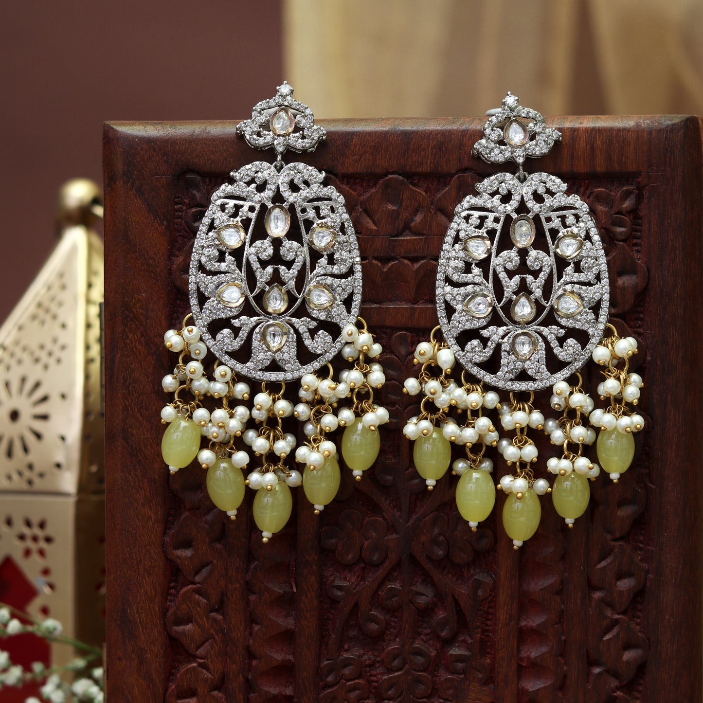 Add a touch of shine to your look with beautiful Ad stones earrings. These gorgeous white stone earrings are made from pure cubic zirconias and are set in gold-plated for added quality. Perfect for any occasion, these earrings come in your choice of size! Yellow beads drops are adding drama to the whole design.