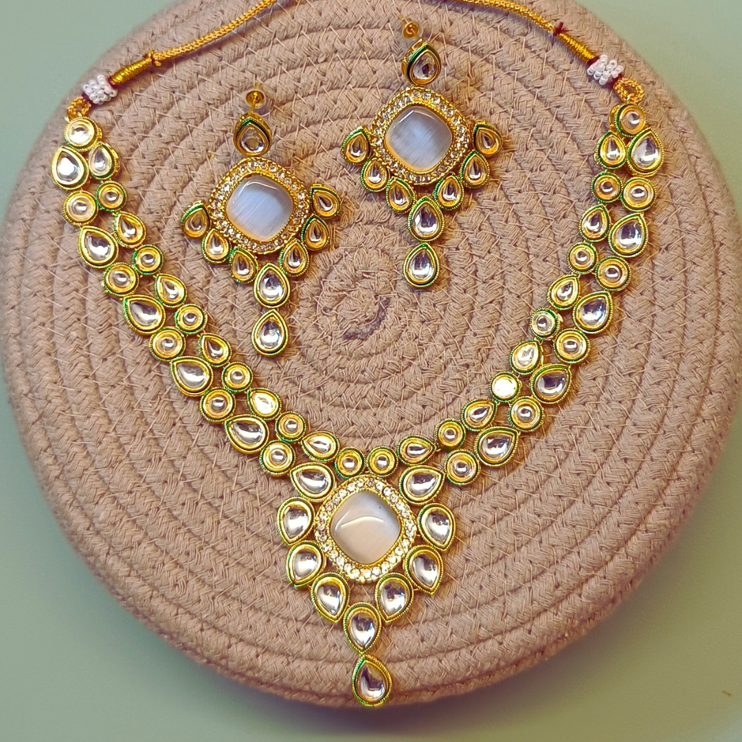 A pair of matching drop earrings, each secured with a post-and-back closure, has kundan-studded detail